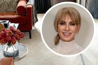 British fashion designer Karen Millen adds modern luxury to her living room with a gorgeous neutral carpet.