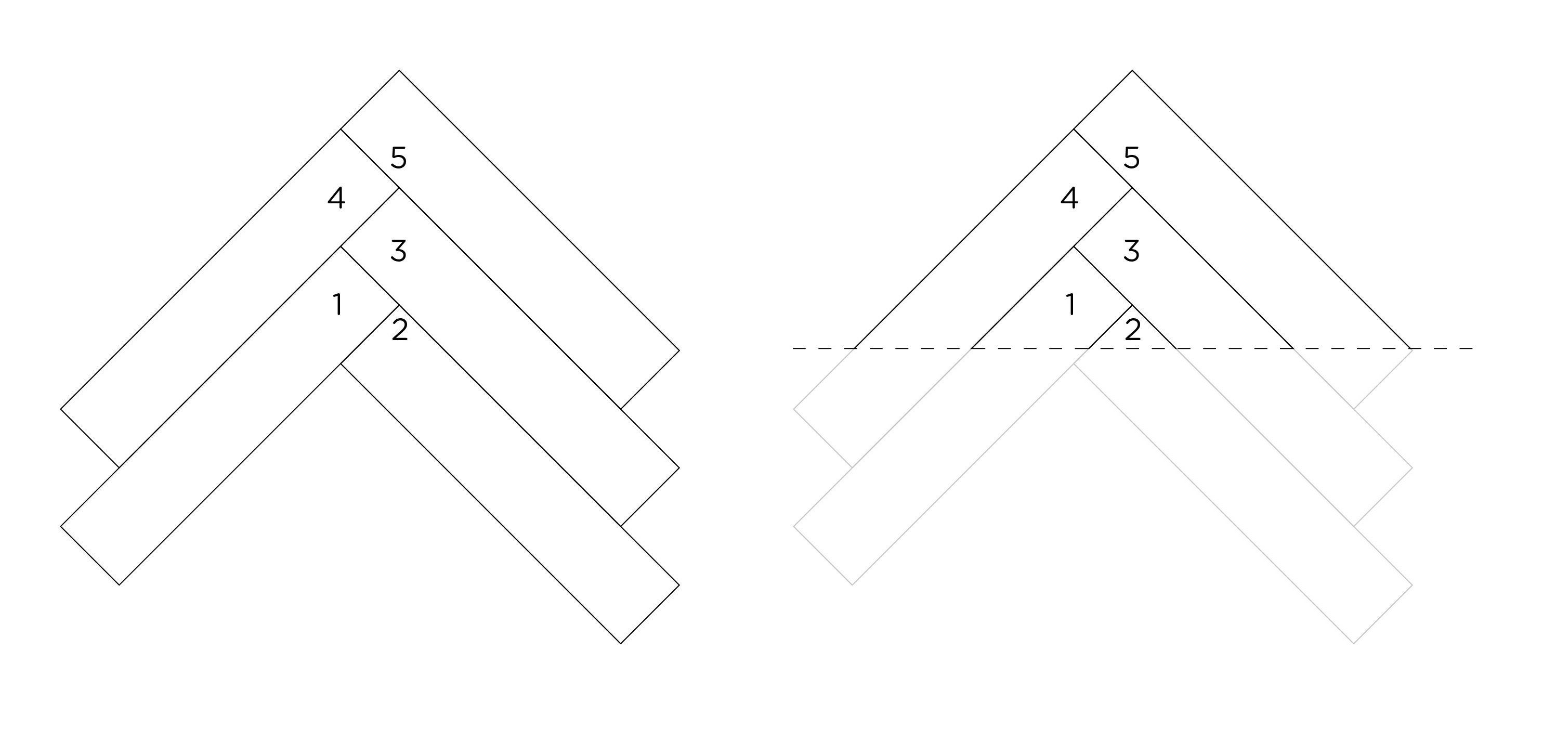 Put your third A board on the right side of the 'V' alongside your second A board and click it into place. Then you’ll add a fourth A board to your second B board's header joint. From the top right corner of your third A board to the top right corner of your fourth A board, draw a straight line with a pencil and ruler, and cut along this line with a saw. This will leave you with an inverted triangle shape, which you should place in the centre of the back wall (the wall facing the door).