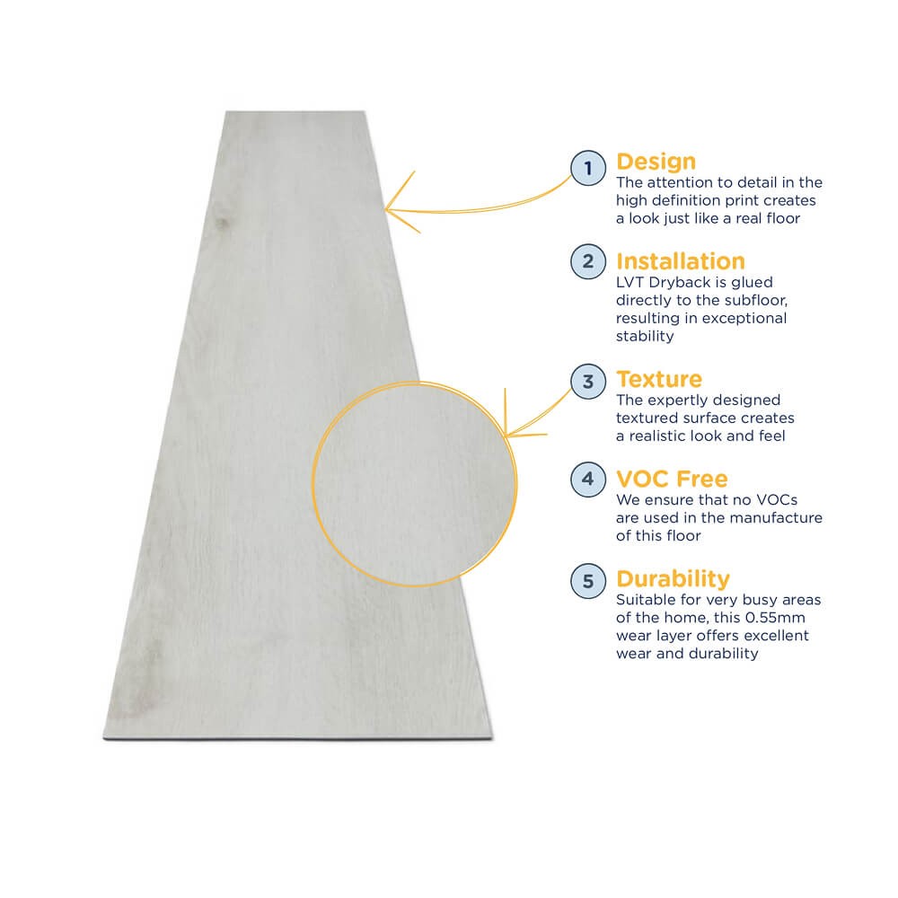 Looking for the gorgeous look of natural wood in your home but worried about the maintenance and price? Combining durability with style, our Kiri Gainsboro Oak luxury vinyl plank is exactly what you’re looking for. In an elegant light grey, it feels just like real wood when you run your hands over its textured surface, but it has all the advantages of LVT! Built to withstand the tests of the modern home, Kiri luxury vinyl is water resistant, UV resistant and slip resistant, so it’s suitable for any room. With a 0.1 Tog rating, it’s great if you’re thinking about underfloor heating. Because of these outstanding credentials, we've awarded Kiri dryback luxury vinyl a whopping 20 year wear guarantee. That’s enough to make anyone feel confident about a purchase!