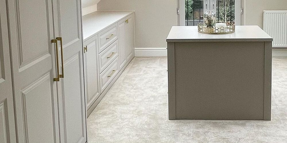 You might also want to consider adding carpet into your walk-in wardrobe instead of a wood, laminate or vinyl flooring. We’d recommend something that’s soft underfoot but durable, like twist carpet. That way, you don’t risk marking or damaging your shoes on hard flooring, but you can rest easy knowing that your carpet is hard-wearing.
